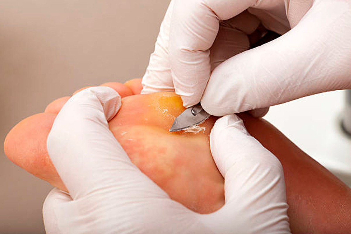 Corns and calluses are painful lesions resulting from pressure and friction. A callus is a thickening of the skin due to pressure. Corns usually form over a bony area of the foot. They form due to excess pressure but are more focal and painful than calluses. Generally they form over the toes, between the toes or on the soles of the feet. A hard centre places pressure on the nerves, resulting in pain.
